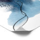 A contemporary, modern abstract art illustration which has a watercolor ink splash in varying shades of blue with paint splashes in blue and black and two black wavy lines. A simple but elegant drawing.