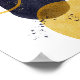 A contemporary, modern abstract art illustration which has two larger shapes in gold and dark navy blue, with a gold circle and splashes of navy and gold paint. A simple but elegant drawing.