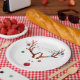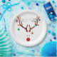 A delightful, bright, classic yet contemporary Christmas party paper plate featuring a modern stylised red nosed reindeer with colourful strings of Christmas lights and ornaments in its antlers. The strings of lights spell out the text "Merry Christmas!"