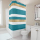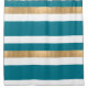 Stylish cloth shower curtain done in a modern bold teal, white and gold tone striped pattern. Matching bathroom accessories are available.