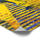 The gold and azure coloured woman's face is created with alternating triangles of fabric and acrylic paint, changing between light and dark. Her face is painted with saffron yellow and royal blue. The fabric and paint create a seamless and separate face. Her hair is painted green and amber. The woman's face is actually a double face - the right side is stretched into a second face. The bottom and top parts of this creation consist of triangles of alternating fabric and paint, and alternating sunglow yellow and ultramarine blue.