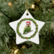 A red masked parakeet, also known as a cherry headed conure sits in a Christmas wreath wearing a Santa hat