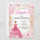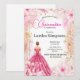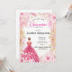 Elegant invitation for a debutante party with pink and gold glitter details. Romantic design with an illustration of flowers.