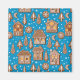 Hand drawn vector pattern featuring various gingerbread houses, fir trees, snowflakes and crescent moon-shaped cookies on blue with falling snow