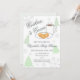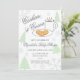 Cookies and cocoa gender neutral baby shower with gray snowflakes and winter green trees bordering a plate of chocolate chip cookies and a mug of hot chocolate
