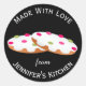 Round baked product sticker done in black, with sweet graphics of a white frosted cookies with colourful sprinkles. Personalise the text to read what you want. Great to add on your packages of baked goods.