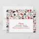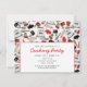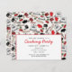 A cooking party invitation with a retro inspired red and black pattern of cooking supplies. Pattern features illustrations of a mixer, stove, whisk, spatula, rolling pin, oven mitt, and cherries. Personalise the text on front and back.