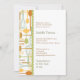 Retro style implements for cooking and eating are featured on this lovely invitation to a "stock the kitchen" Bridal Shower for the bride-to-be. The muted colour scheme is fun and neutral with forks, spoons, knives, spatulas and whisks in shades of umber, gold, brown and sage green, set against a white background, and a touch of whimsy with a "faux" ric rac ribbon border in sage.