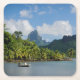 Coaster with the tropical Cook's Bay with a boat and volcano background with palm trees and jungle on the island of Moorea, near Tahiti in the Pacific archipelago French Polynesia.
