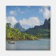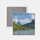 Souvenir photo magnet of the tropical Cook's Bay with a boat and volcano background with palm trees and jungle on the island of Moorea, near Tahiti in the Pacific archipelago French Polynesia.