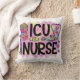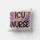 Cool and Colourful ICU Nurse design throw pillow features a stethoscope, needle, hearts, bandage, cup of coffee, and text that reads ICU Nurse, great for all the ICU nurses out there!