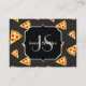 Personalise and customise elegant business card with your initial name and business information. Cool and fun pizza slices pattern on dark grey - unique gift for foodies, restaurateurs, pizzerias.. Juicy vector made pizza with crunchy crust, cheese, salami, champignon mushrooms, olives and a sprinkle of oregano.