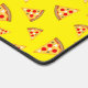 Cool and fun pizza slices pattern on bright yellow. Juicy vector made pizza with crunchy crust, cheese, salami, champignon mushrooms, olives and a sprinkle of oregano.
