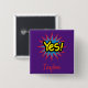 A cool and trendy popular art designed button, this item features "Yes" in yellow in black outline with a red and blue star symbol on a purple background. Your name is written in fun red font.