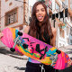 This vibrant artwork, made using a unique mixed media graphics technique, is an exquisite depiction of an adorable girl on a skateboard, against a backdrop of swirls and splashes of rainbows!