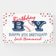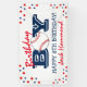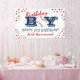 'Birthday Boy' baseball themed happy birthday banner, featuring navy blue and red text on a classic white background, stars, and a sporty birthday template that is easy to customise.