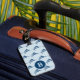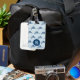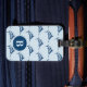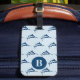 Cool navy blue swordfish pattern on light blue monogrammed luggage tag.