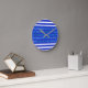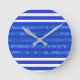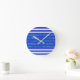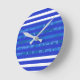 Cool Chic Blue Geometric Stripes Round Clock. Modern, popcorn anime style, festive refreshing fashionable, elegant design, chic and sophisticated, fun design