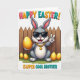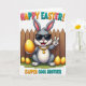 Designed with a cool, human-like rabbit front and center, this card shows soft gray fur, a white belly, and pink touches inside the tall ears and on the nose 🐰. Dark sunglasses cover its eyes, yet the slight tilt of its smile and relaxed pose suggest a friendly, affectionate confidence. A chunky gold chain with a shiny medallion rests on its chest as it hugs a large golden egg in one hand and raises a peace sign with the other 🐇. The rabbit stands on green grass where several smaller golden eggs are scattered, like a shared hunt between close companions. Behind it, a rustic wooden fence in warm brown tones adds a cozy, outdoorsy setting against a white backdrop. Across the top, “HAPPY EASTER!” appears in thick, rounded letters shaded in pink, teal, and orange, and near the bottom “SUPER COOL BROTHER” is set in matching, colorful text. The golden eggs gleam with bright highlights, and the fence slats show subtle wood grain lines.