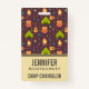 Name tag with a fun camping themed pattern. Set on a reddish brown background. Elements in the pattern include a campfire, a tent,. a guitar, a shovel and backpack.