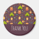 A thank you magnet with a fun camping themed pattern. Set on a reddish brown background. Elements in the pattern include a campfire, a tent,. a guitar, a shovel and backpack.