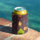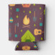 Can cooler designed with a cute camping pattern. Camping themed items such as an orange campfire, a green tent, an acoustic guitar and other nature