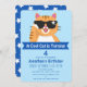 Celebrate the cool cat's special day with this Cool Cat Child's Birthday design. This Invite features a cute orange tabby cat with sunglasses against a light pastel background. The reverse is a pattern of white stars.