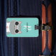 Turquoise luggage tag with a cool grey cat wearing sunglasses. Personalise with name and initial in black and white.