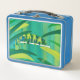 Cool looking chameleon that I made from acrylic paint skins, is printed on metal lunch boxes. This pretty chameleon is green, blue, and yellow, is sitting on a light coloured branch among green and yellow leaves. The background behind the chameleon is vertical blends of light green, blue, and yellow. The design is printed on both sides. Thank you for shopping at CherylsArt on Zazzle.