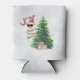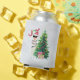 A can cooler with a funny illustration. A cute llama wearing black sunglasses and a red santa hat. Standing behind a Christmas tree with festive presents. The word Joy written above his head in a colourful holiday font. Silver bokeh background. Whimsical and fun Christmas themed design.