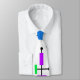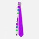 This necktie has a mid-century modern design of a grid made of horizontal and vertical black lines with rectangles in various vibrant shades of green, blue, and purple.