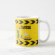 Cool custom construction excavator mug for a child who loves yellow construction vehicles in black and yellow. Fun vehicle gift for a little boy who loves cars and trucks. Customise with your kid's name under the black and yellow caution tape.