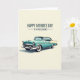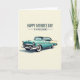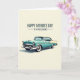 This design shows a classic mid-century two-door coupe sitting in the lower middle, like a trusty companion on a slow Sunday drive 🚗. The car wears a calm seafoam green body with a creamy ivory roof and rear panels, and the shiny chrome bumpers and grille catch the light like a proud smile from dad 👨. White-walled tires and bright window trim add a polished, old-school look that feels like a friendly nod between generations. Above the car, a line of uppercase sans-serif text in matching green reads “HAPPY FATHER’S DAY TO A TRUE CLASSIC!” with the words centered and spaced evenly. A thin horizontal line sits beneath the message, separating the greeting from the illustration and keeping the layout tidy. The background is a warm, soft ivory that makes the green and chrome stand out without feeling harsh. The overall scene carries a gentle, companionable warmth, like a quiet moment shared while admiring something well cared for. The coupe’s seafoam body, ivory top, chrome details, and white-walled tires are drawn with crisp edges against the plain ivory backdrop.