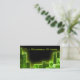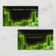 A cool dj businesscard template with a stunning design of a big pile green flurocent glowing speakers and green laser lights in the night sky combined with black backlight music notes on a dark background.