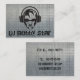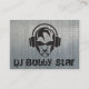 A cool dj logo cartoon business-card template. A stunning professional design with dj head with headphone cartoon and the text dj on a metallic background combined with the logo of a abstract headphone. a good dj business card.