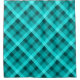 A shower curtain featuring an elegant plaid pattern design in cool, calming turquoise.
