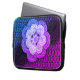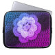 Purple and blue shades floral image printed on electronics bag is from a photo of an original crocheted creation designed handmade and Copyright © by published designer Delores Chamblin. The picture of the unique handcrafted bag with fancy stitches, flower, leaves and button is reproduced on the travel case. The shade is digital filter.