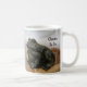 A cool frog sitting on a wicker basket accents this coffee mug. The message says 'green is in' this can be changed if so desired.
