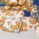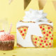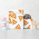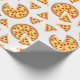 Cool fun pizza and slices pattern on white Wrapping Paper. Birthday pizza party Gift Wrapping Supplies. Juicy vector made pizza with crunchy crust, cheese, salami, champignon mushrooms, olives and a sprinkle of oregano.
