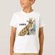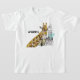 A giraffe is in shades of brown, beige and its pattern and hair is in gold. It's a male giraffe with black glasses and a black tie. The background is stylised town image in grey, light blue and pink. The text is in black and customisable. This is a digital illustration.