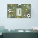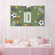 This cool and modern soccer-themed kids’ birthday banner features a vibrant green design with playful illustrations of a football (soccer ball), trophies, stars, goals, and soccer boots, and a matching sporty pattern on the back. Easily personalise with your child’s name, age, and party details—perfect for welcoming guests to any football-themed birthday celebration.