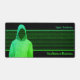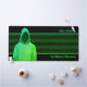 A cyber-themed design in shades of green on black, with a cool grungy effect on the hooded hacker and a background of binary ones and zeroes. Your name, company details or other text will appear in a coordinating vivid green. There's room for a business tagline, job title, security joke or hacking slogan in the upper right corner in bright aqua coloured lettering.