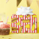 Cool patterned wrapping paper printed all over with hot dogs in buns with mustard splashes and mustard bottles, on a red and white striped background