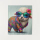 This image features a cute lamb dressed in a vibrant, patterned suit and wearing sunglasses, adding a lively and entertaining persona to the image. A flower is delicately placed on the sheep's right ear adding further charm to the character. This colourful sheep is set against a light-coloured background, further emphasizing the vivid details of the sheep's attire. The brightness of the colours and the playful details give the image a cheerful and eye-catching ambiance.