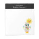 A notepad with a cool looking llama wearing some dark sunglasses. Dressed in a colourful striped scarf and fun little boots. A bright yellow sun with a happy kawaii face in the background. Whimsical colourful triangles surround this fun loving llama. Black background along the top border with your name personalised inside.