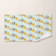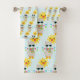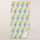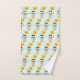 Towel set with a cool looking llama wearing some dark sunglasses. Dressed in a colourful striped scarf and fun little boots. A bright yellow sun with a happy kawaii face in the background. Whimsical colourful triangles surround this fun loving llama. Blue background.