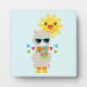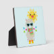 A photo plaque with a cool looking llama wearing some dark sunglasses. Dressed in a colourful striped scarf and fun little boots. A bright yellow sun with a happy kawaii face in the background. Whimsical colourful triangles surround this fun loving llama. Blue background.