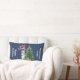 A lumbar pillow with a funny illustration. A cute llama wearing black sunglasses and a red santa hat. Standing behind a Christmas tree with festive presents. The word Joy written above his head in a colourful holiday font. Set on a blue background. Whimsical and fun Christmas themed design. Text says Merry Christmas, Happy Holidays.