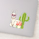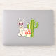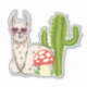 A vinyl decal illustrated with a cute llama wearing heart-shaped sunglasses. A mushroom and a green cactus complete the illustration. Whimsical and cute.