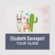 A name tag illustrated with a cute llama wearing heart-shaped sunglasses. Some stars, a mushroom and a green cactus complete the illustration. Whimsical and cute.